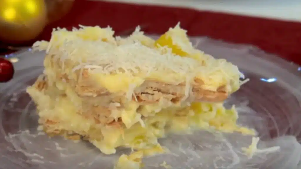 Quando o creme atingir a temperatura ambiente, já é o momento certo de começar a montagem. Então agora, o próximo passo é adicionar a metade da mistura em uma vasilha e fazer uma camada por cima com as bolachas de maizena. Depois, faça mais uma camada com creme e finalize com a calda de abacaxi.(Vídeo reprodução: YouTube) - Polvilhe um pouco de coco ralado por cima para finalizar