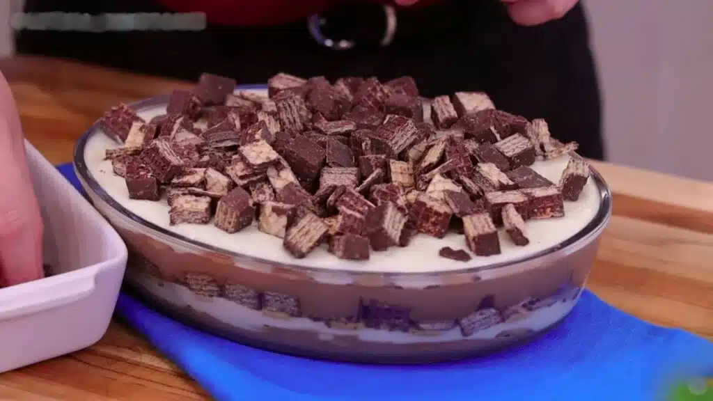 Neste próximo passo você pode utilizar uma travessa de vidro de 25x17cm e 5,5cm de altura. Comece colocando metade do creme de chocolate para fazer a primeira camada, em seguida, utilizando um pacote de 170g de bolacha maisena molhe uma por vez no leite até e coloque uma ao lado da outra por cima do chocolate até cobrir todo o espaço. A próxima camada será a do creme branco, divida em duas partes e depois refaça o processo das bolachas. Agora vamos usar parte da nossa quantidade de chocolate bis, que será de duas caixas. Corte em quatro parte todos os chocolates bis de uma das duas caixas, despeje por cima das bolachas que estão por cima da camada de creme branco e espalhe bem. Agora coloque a outra metade do creme de chocolate, a última camada de bolachas e a última camada de creme branco, depois disso é só cobrir com plástico filme e levar para a geladeira por algumas horas (em média cinco horas) ou mesmo de um dia para o outro se possível.