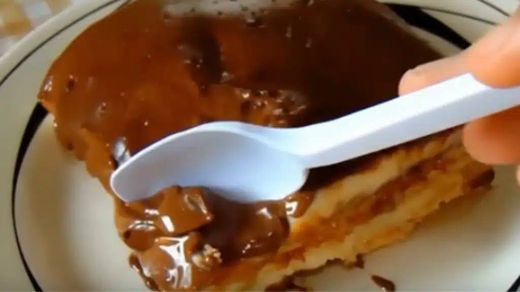 Agora, o próximo passo é levar o chocolate ao leite para derreter em banho maria. Você também pode fazer o procedimento no microondas de 30 em 30 segundos até o chocolate ficar bem molinho. - Retire o Pavê de Bolacha de Geladeira e Adicione a Cobertura